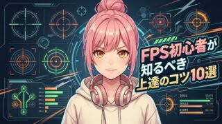 FPS初心者向けに上達のコツ10選を徹底解説。エイム練習法、立ち回り、デバイス設定、マップ理解まで、プロゲーマーも実践する基本テクニックを網羅。VALORANT、Apex Legends、Call of Dutyなど全FPSに共通する上達法を紹介。