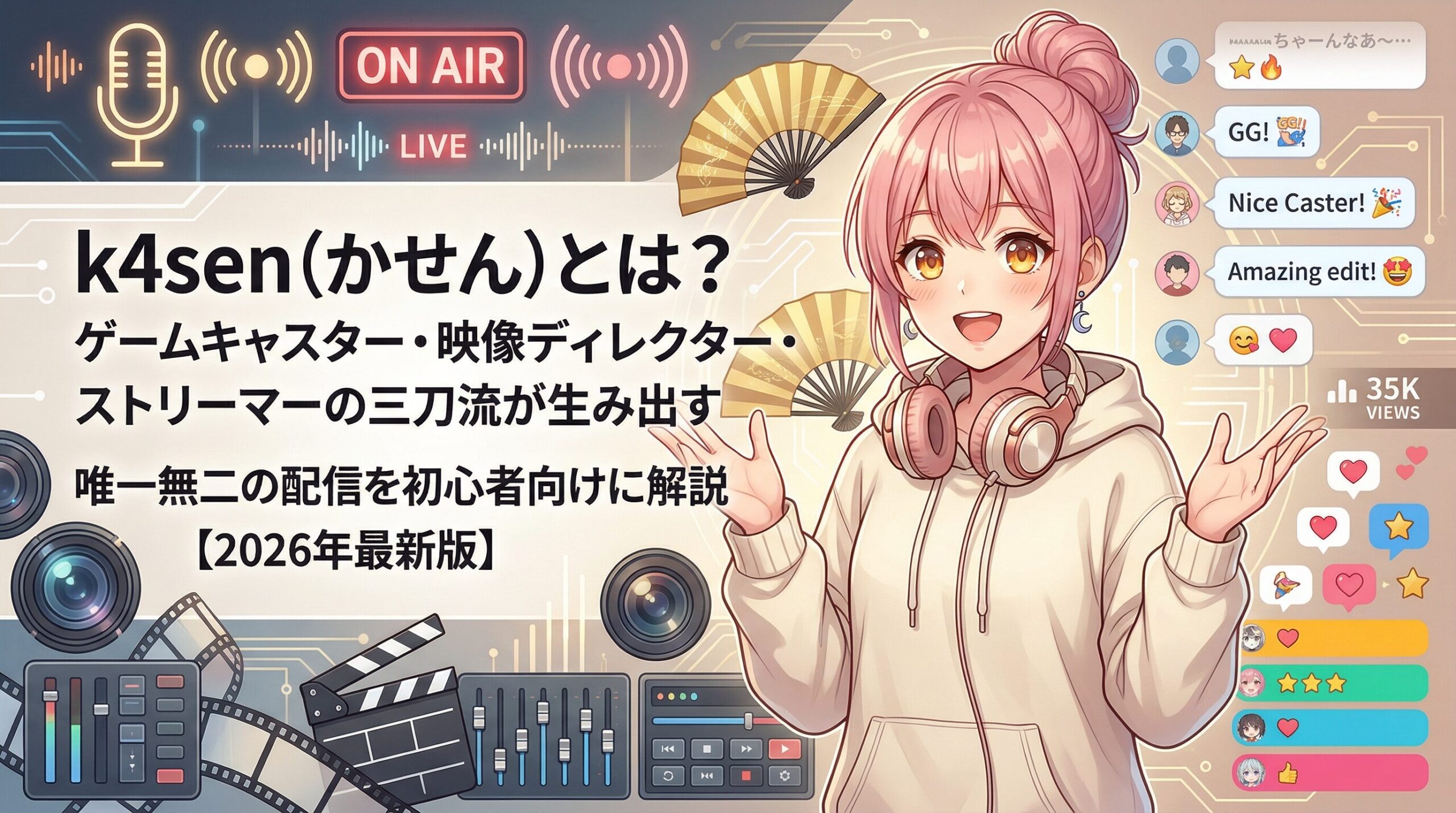 ゲーム実況者・ゲームキャスター・映像ディレクター——これらすべてを高水準でこなす、まさに配信界の「三刀流」と呼ぶべき存在がk4sen(かせん)だ。1991年9月15日生まれ、大阪府出身。Twitchフォロワー数100万人超、YouTube登録者数も2025年に100万人を突破し、2026年現在もその勢いは衰える気配がない。eスポーツチーム「ZETA DIVISION」のCREATOR部門に所属しながら、映像制作会社「合同会社電影Lab.」の代表も兼務するという、ストリーマーの枠を大きく超えた活躍を続けている人物だ。